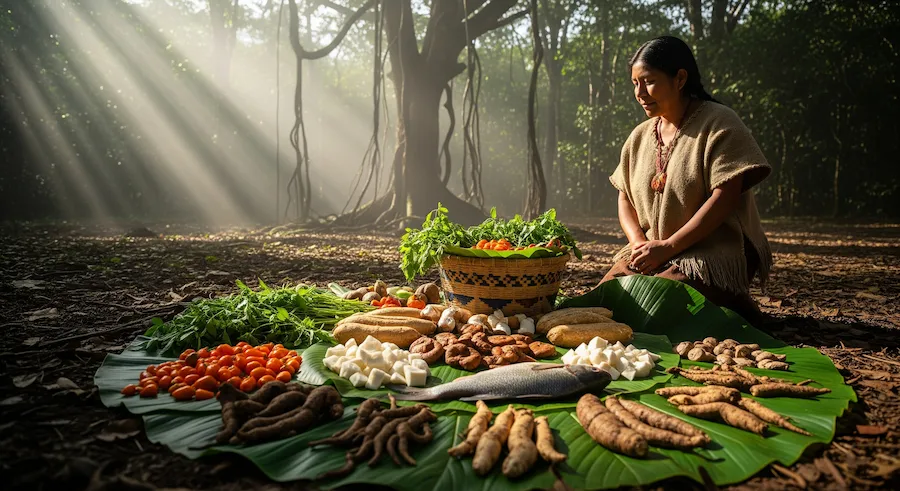 La selva provee frutas, raÃces, especias, carnes y hierbas, base de recetas que preservan el vÃnculo entre naturaleza y cultura viva.