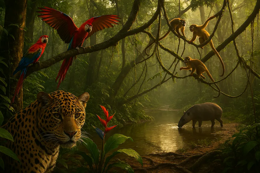 Entre rÃos y bosques habitan jaguares, guacamayos, delfines rosados y monos, especies emblemáticas que sostienen el equilibrio natural.
