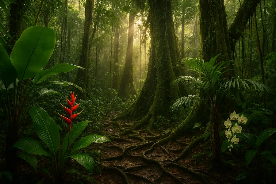 La selva peruana alberga árboles gigantes, palmeras y plantas sagradas, fuente de alimento, madera, medicina y refugio para la vida silvestre.