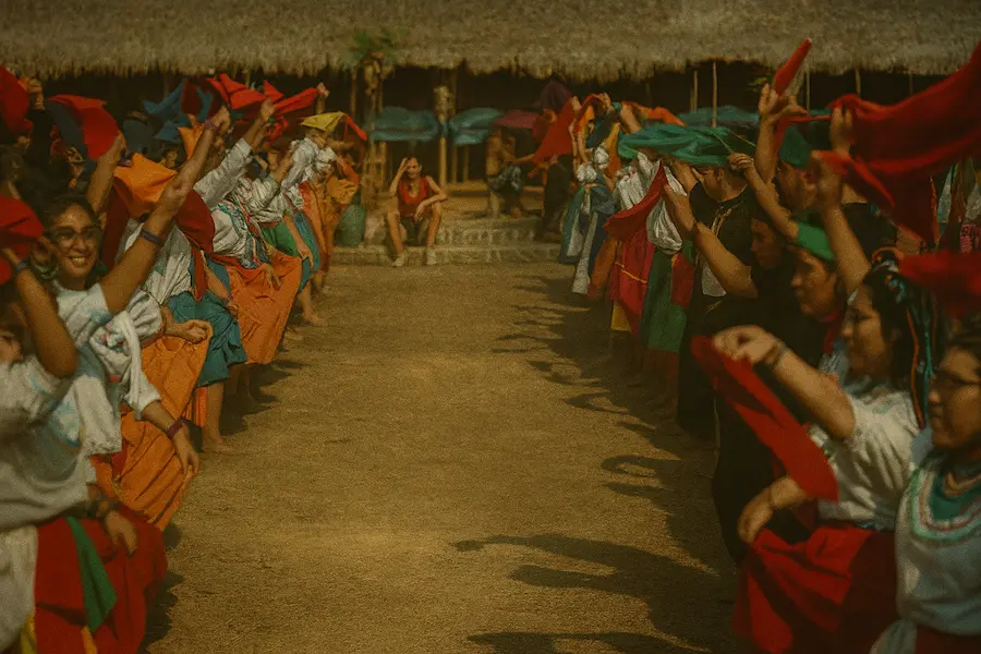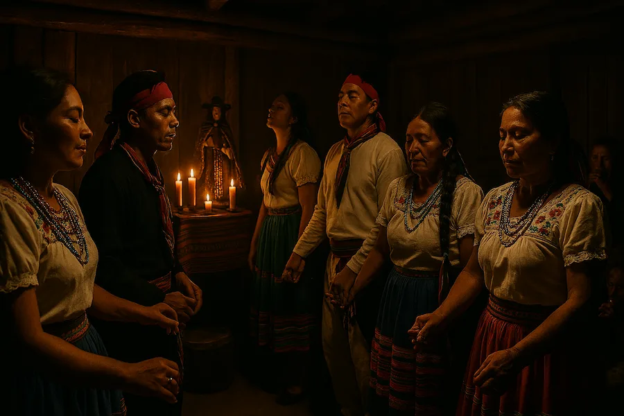 La danza fluye toda la noche. A veces, en medio del silencio, una voz femenina se alza. Son las dichucas, guioneras de la ceremonia. Se arrodillan, suplican, piden. Hablan con el santo como si hablaran con su abuelo o con el monte. Luego, los hombres se acercan, toman a las mujeres de la mano y juntos continúan danzando, como si el movimiento sellara la petición.